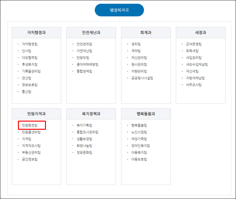 - 민원지적과 : 민원행정팀, 지적팀, 지적재조사팀, 부동산관리팀, 공간정보팀이 있습니다.