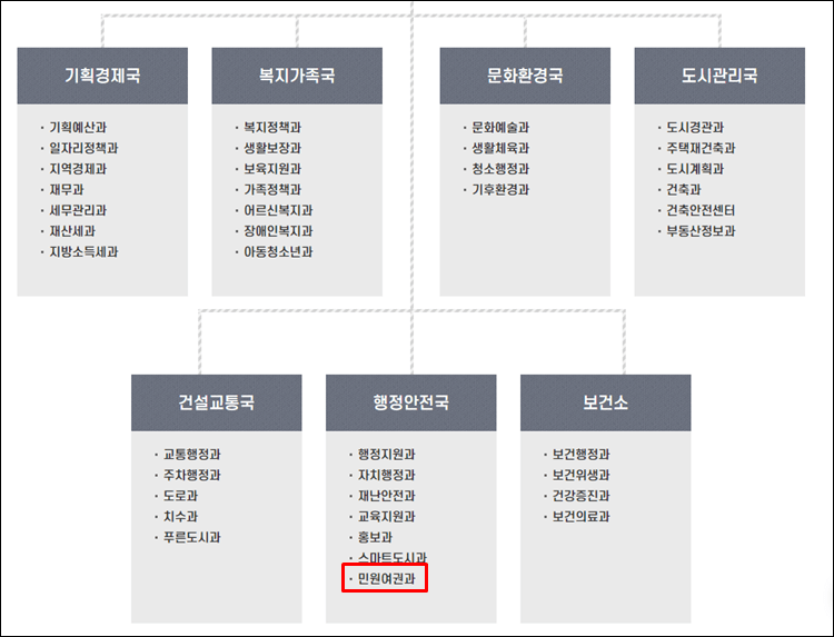 - 기획경제국 : 기획예산과, 일자리정책과, 지역경제과, 재무과, 세무관리과, 재산세과, 지방소득세과