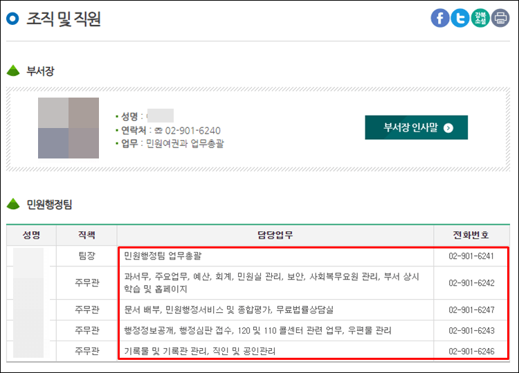 아래처럼 민원여권과 직원들의 직책, 성명, 담당업무, 전화번호를 확인할 수 있습니다.