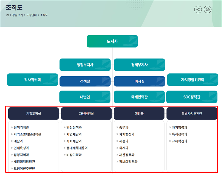 강원도청의 부서 조직도를 보면 아래와 같습니다.