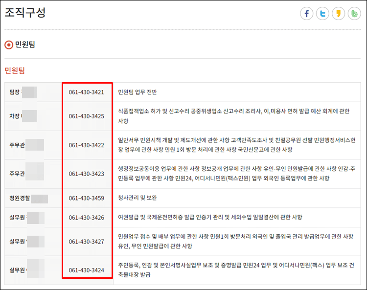 강진군청의 민원팀을 클릭하신다면 아래와 같이 이름, 전화번호, 주요 업무를 조회하실 수 있습니다.
