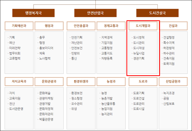 - 도시건설국 : 도시개발과, 건설과, 도로과, 산림공원과, 건축허가과 등