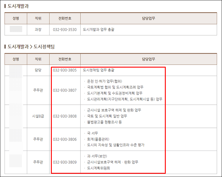 직위와 성명, 전화번호, 담당업무가지 확인이 가능한 모습을 보실 수 있습니다.