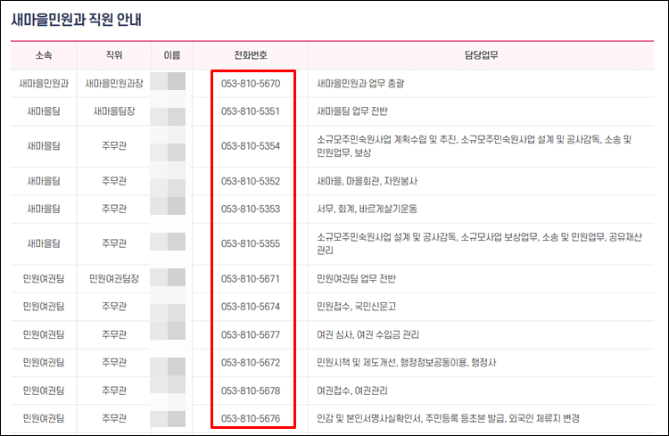 경산시청의 새마을민원과의 팀, 직위, 이름, 전화번호, 담당업무를 조회할 수 있습니다.