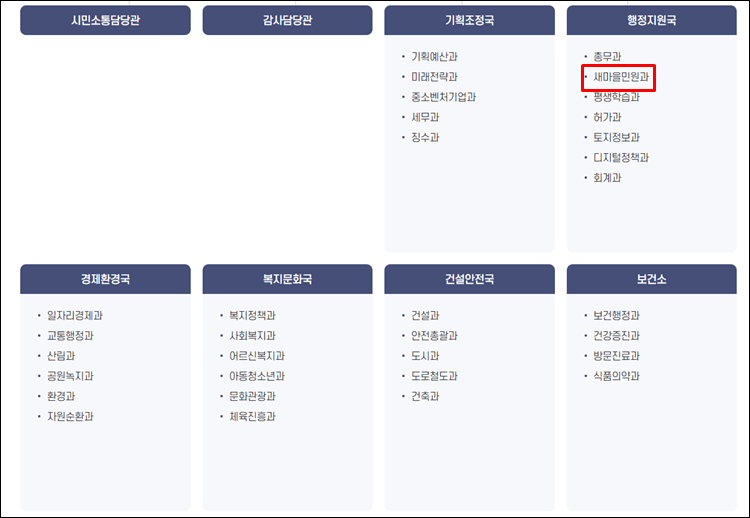 민원을 많이 담당하는 새마을 민원과를 클릭해 보겠습니다.