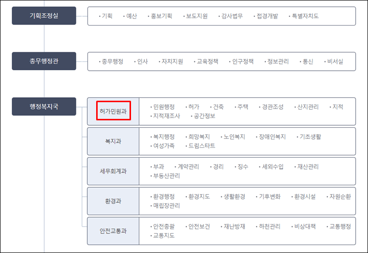 고성군청의 조직도를 살펴보았다면, 허가민원과를 발견할 수 있으실 겁니다.