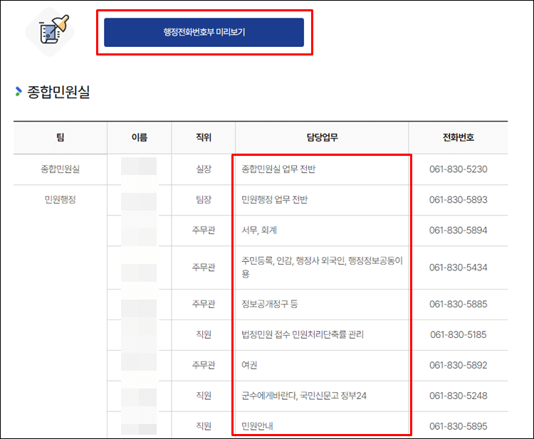 해당 부서를 클릭하시면 아래와 같이 행정전화번호부를 전체 보기 하실 수도 있고, 아래에서 팀과 이름, 직위, 담당자 전화번호를 확인할 수도 있습니다.