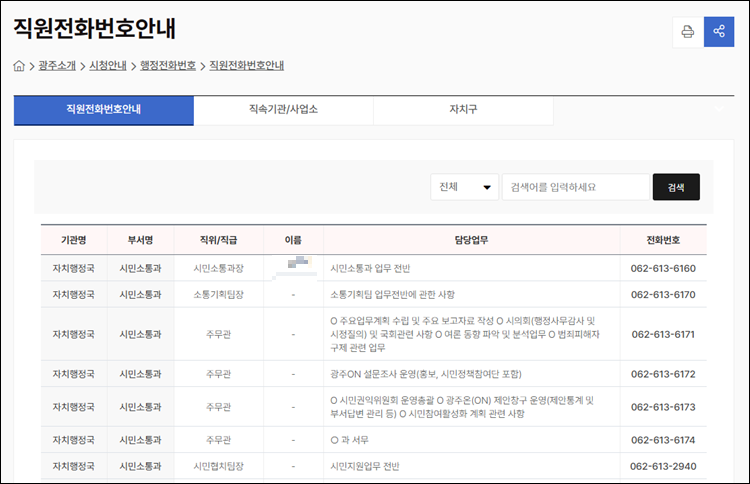 오늘은 광주광역시 홈페이지에서 조직도와 직원 전화번호를 조회해 보았습니다.