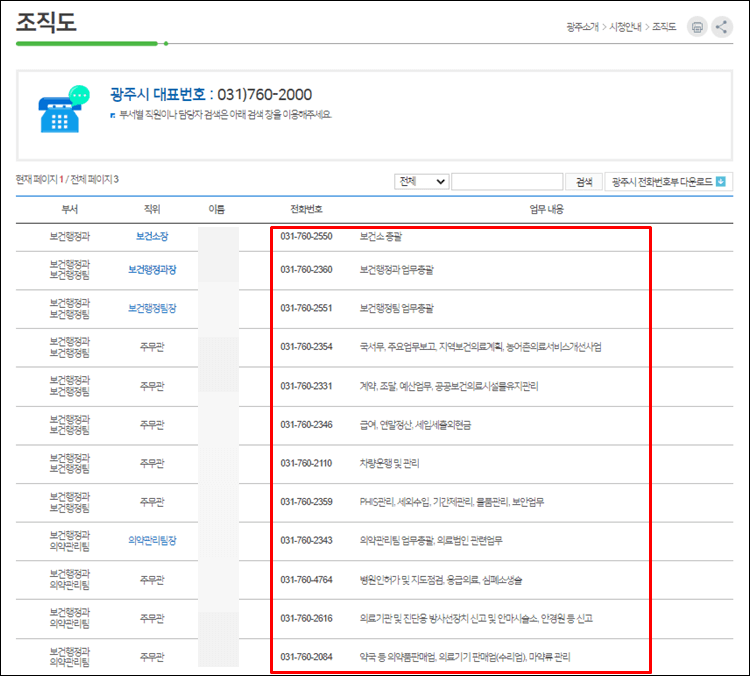 부서명을 클릭하시면 아래와 같이 광주시청 대표전화번호와 함께 부서, 직위, 이름, 전화번호가 나옵니다.