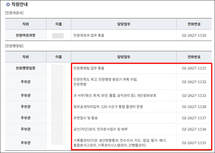 본인이 어느 민원실을 찾을 것인지 아신다면 해당 부서를 클릭해 보세요. 직원과 전화번호를 아실 수 있습니다.