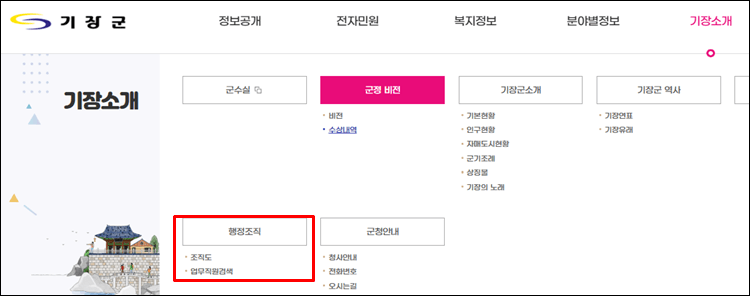 기장군청 홈페이지를 방문하시면 아래와 같이 기장소개에서 행정조직을 살펴보실 수 있습니다.