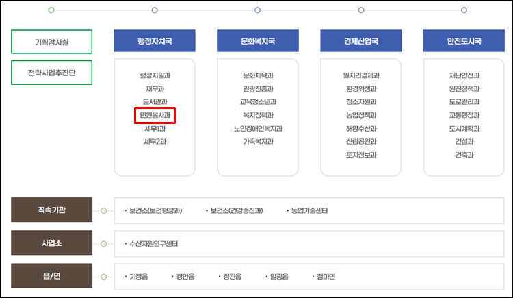 - 행정자치국 : 행정지원과, 재무과, 도서관과, 민원봉사과, 세무 1과, 세무 2와