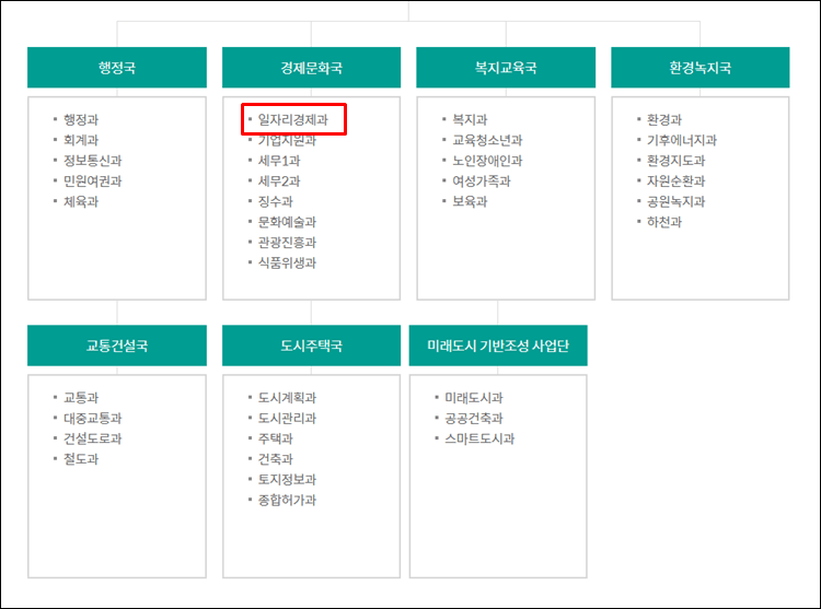 • 경제문화국 : 구인구직을 원한다면 일자리경제과를 눌러보세요. 세무와 문화예술을 담당합니다.