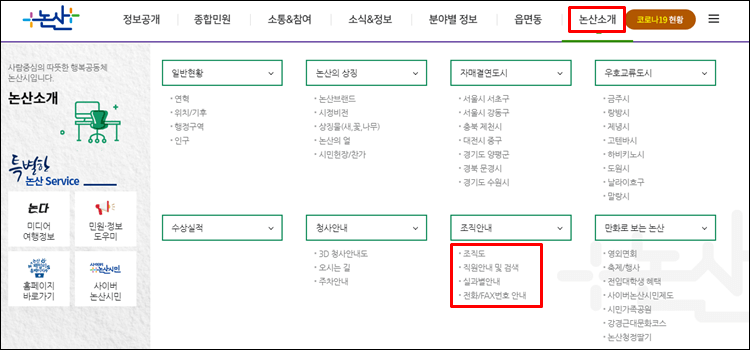논산시청 홈페이지 조직도 및 전화번호 조회하기