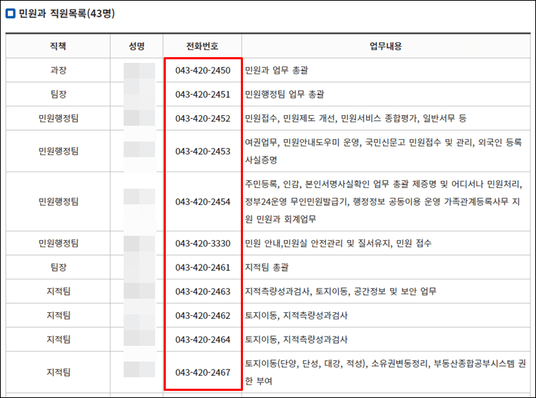 민원과를 누르시면 아래와 같이 직책, 성명, 전화번호, 업무내용을 살펴보실 수 있습니다.