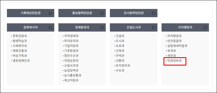 - 자치행정국 : 자치행정과, 안전총괄과, 공동체 새마을과, 회계과, 세무과, 민원정보과