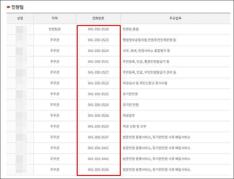 성명, 직책, 전화번호, 주요 업무를 보실 수 있습니다.