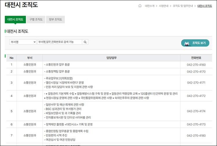 대전광역시 홈페이지 조직도 및 직원 전화번호 바로가기