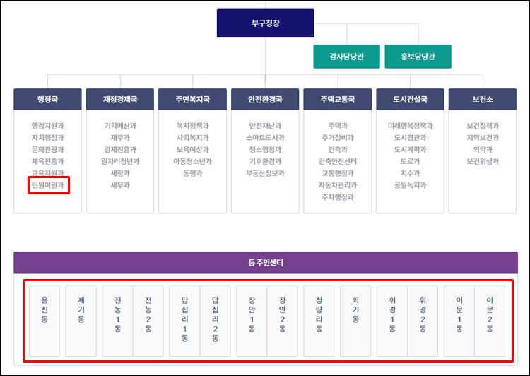 - 주민복지국 : 복지정책과, 사회복지과, 보육여성과, 아동청소년과, 동행과