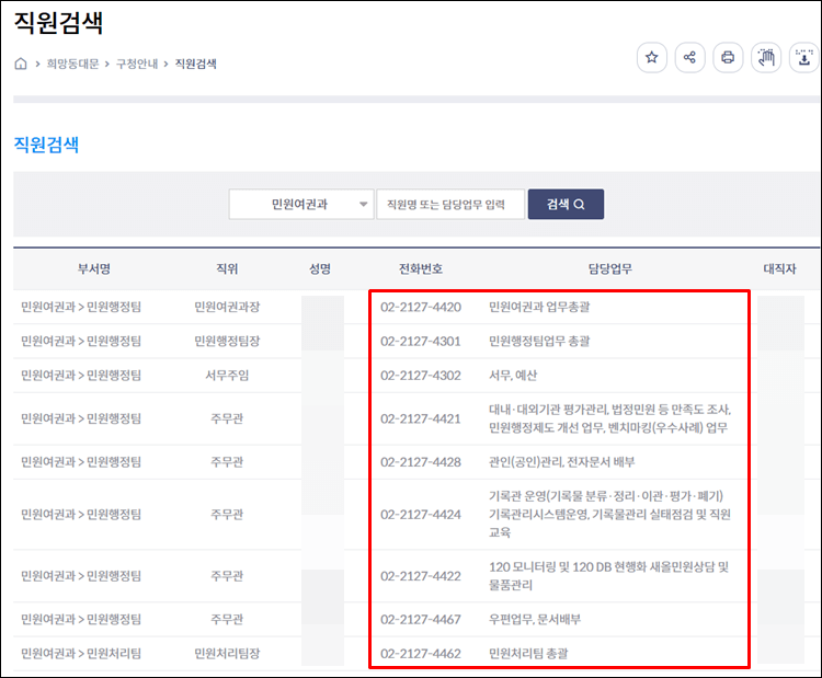 부서명, 직위, 이름, 전화번호, 담당업무까지 파악이 가능하니 사전에 상담을 하고 가실 수 있습니다.