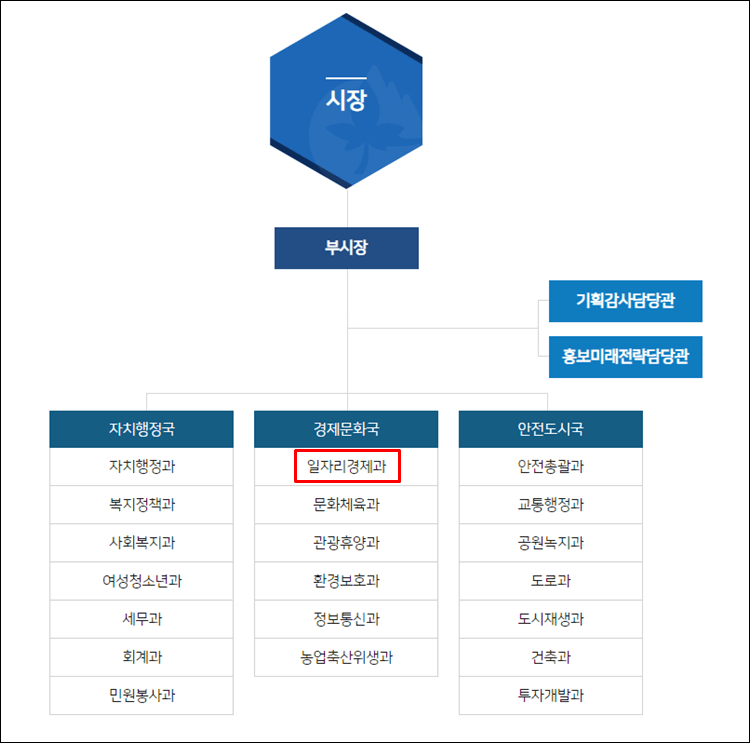 - 자치행정국 :자치행정과, 복지정책과, 사회복지과, 여성청소년과, 세무과, 회계과, 민원봉사과
