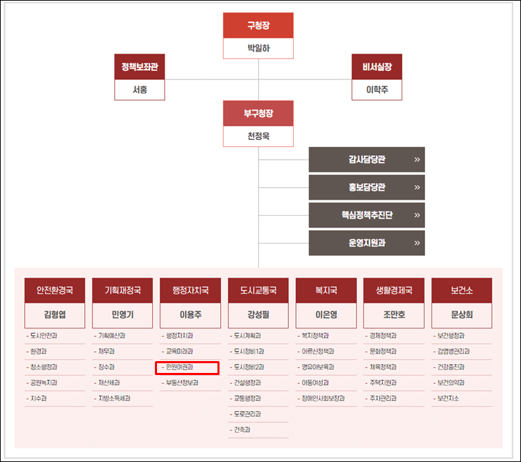 해당 구청의 업무를 보시기 전 홈페이지를 방문하시면 부서와 전화번호를 검색해 보실 수 있습니다.