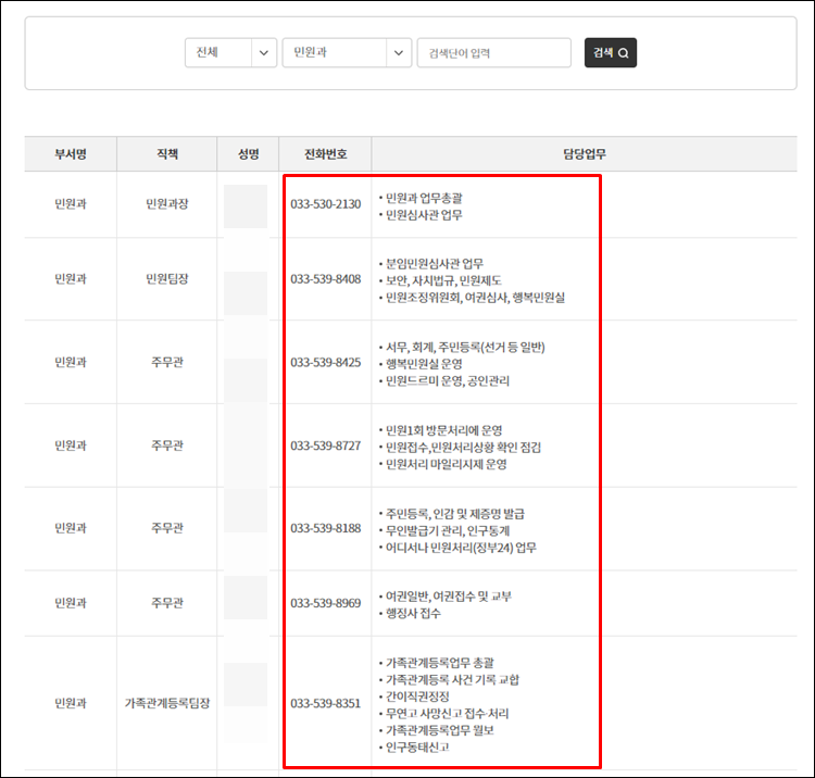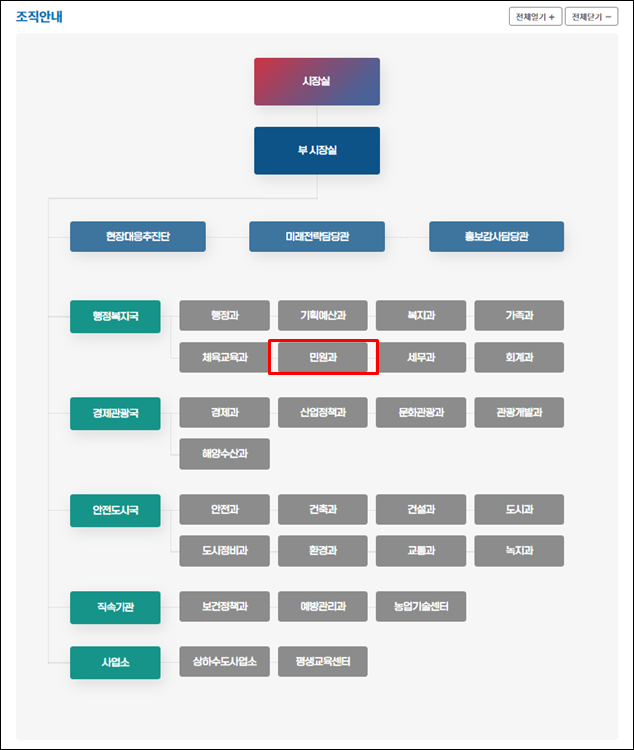 따라서 위의 조직도에서 민원과를 클릭해 보았습니다.