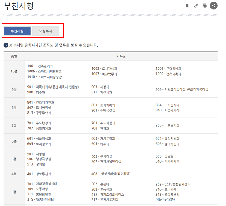 각각의 층별 안내도를 보실 수 있는데, 부천 본청은 10층까지 이루어져 있고, 외청들은 각각의 건물에 위치해 있습니다.