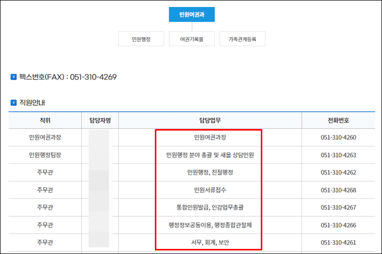 해당 부서이름을 클릭하시면 아래와 같이 직원이름과 담당업무, 전화번호를 조회할 수 있어 미리 전화로 상담받을 수 있습니다.