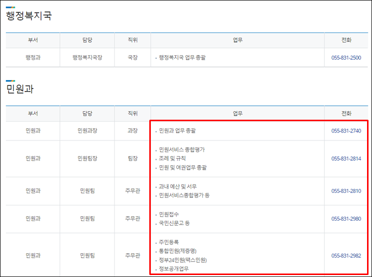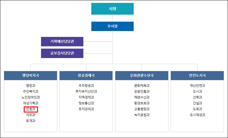 행정복지국에는 민원과가 위치해 있는데, 가장 많은 업무를 담당하는 곳이므로 해당 부서를 알아보도록 하겠습니다.