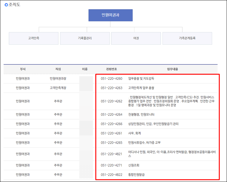 민원을 가장 많이 담당하는 곳은 민원여권과 일 텐데요, 해당 부서의 이름을 클릭하시면 직원과 전화번호를 조회하실 수 있습니다.