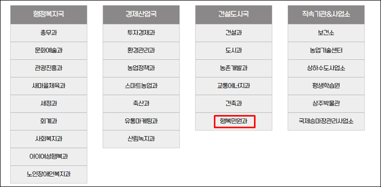- 건설도시국 : 건설과, 도시과, 농촌개발과, 교통에너지과, 건축과, 행복민원과