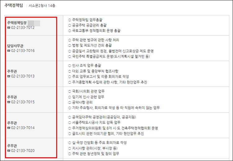 예를 들어 주택과 관련한 부서의 탭을 누르시면 세분화된 업무 담당자와 그 전화번호를 한눈에 보실 수 있습니다.