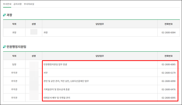 아래와 같이 직원과 전화번호를 확인하실 수 있어 민원실 업무를 더욱 효율적으로 처리할 수 있습니다.