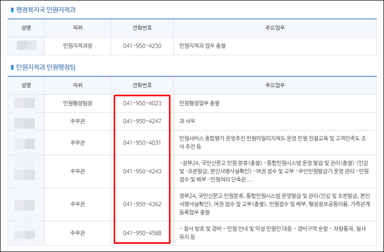 성명, 직위, 전화번호, 주요 업무를 확인해 보실 수 있습니다.
