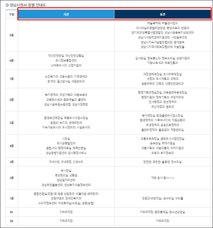 성남시청은 9층까지의 건물에 서관과 동관으로 이루어져있습니다.