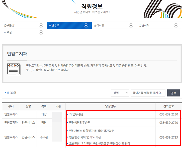 3. 속초시청 직원이름 및 전화번호 바로가기