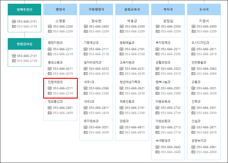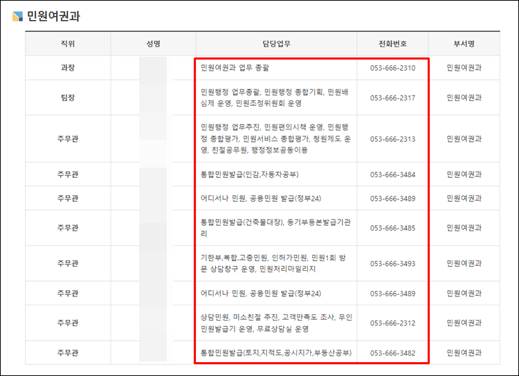 위의 조직도에서는 민원실 대표번호를 보았다면, 아래에서는 직원들 각각의 자리 번호를 보실 수 있는 것입니다.