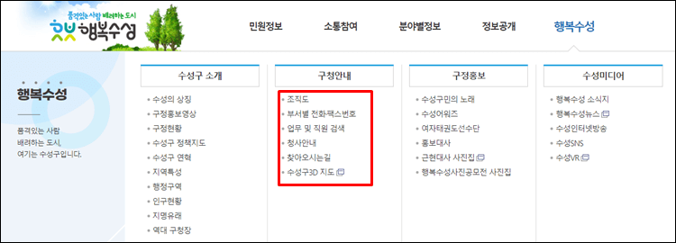 수성구청 홈페이지를 방문하시면 아래와 같이 행복수성탭에서 구청에 대한 다양한 정보를 확인해 보실 수 있습니다.