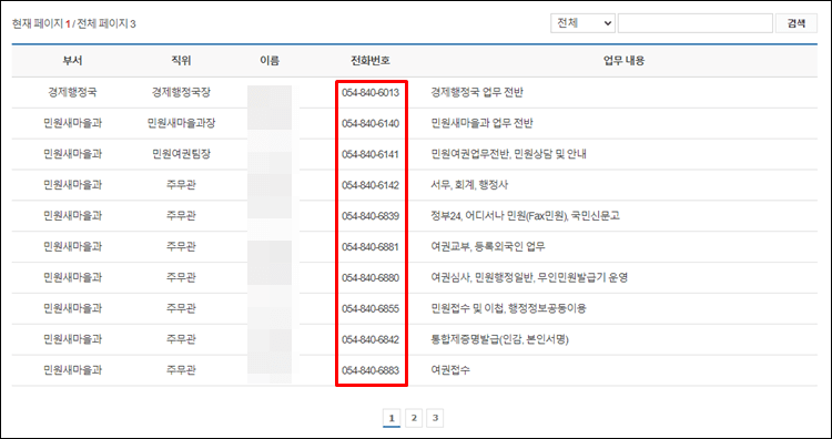 아래와 같이 부서, 지구가, 이름, 전화번호 조회가 가능합니다.