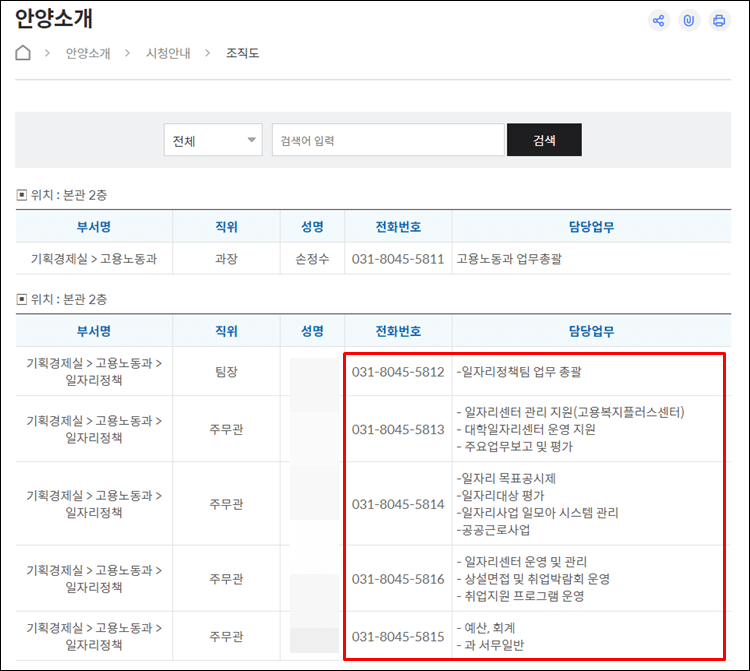 해당 부서이름을 선택하면 아래처럼 담당업무와 전화번호를 확인할 수 있습니다.