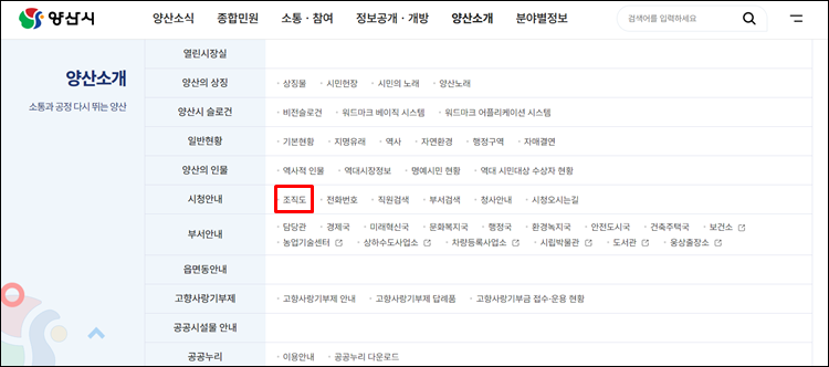 양산시청 홈페이지 조직도 및 전화번호 바로가기