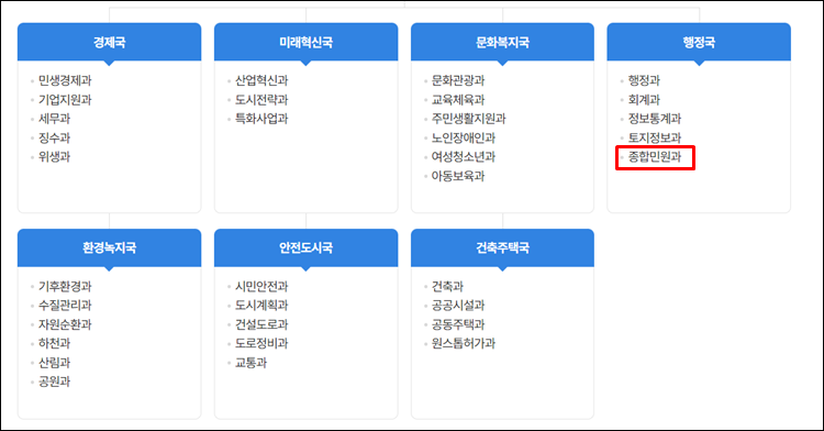 - 경제국: 민생경제과,기업지원과,세무과,징수과,위생과