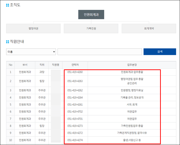 부서명을 클릭하시면 아래처럼 직원 연락처, 업무분장을 볼 수 있습니다.