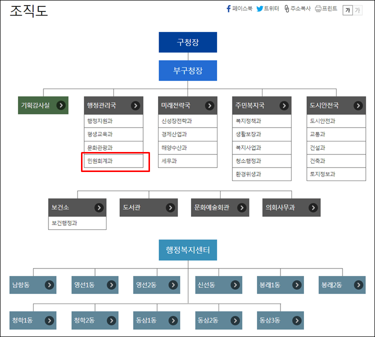 민원회계과의 부서를 살펴보니 행정여권과, 가족민원과, 회계계약과가 있는 것을 알 수 있습니다.