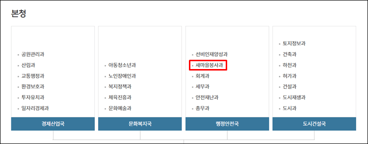 - 행정안전국 : 선비인재양성과, 새마을봉사과, 회계과, 세무과, 안전재난과, 총무과