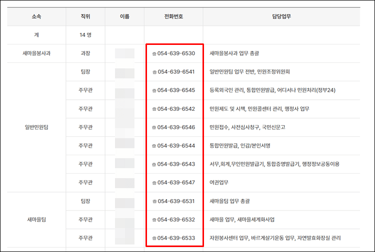 원하시는 부서를 클릭하시면 전화번호와 직원이름 조회가 가능합니다.