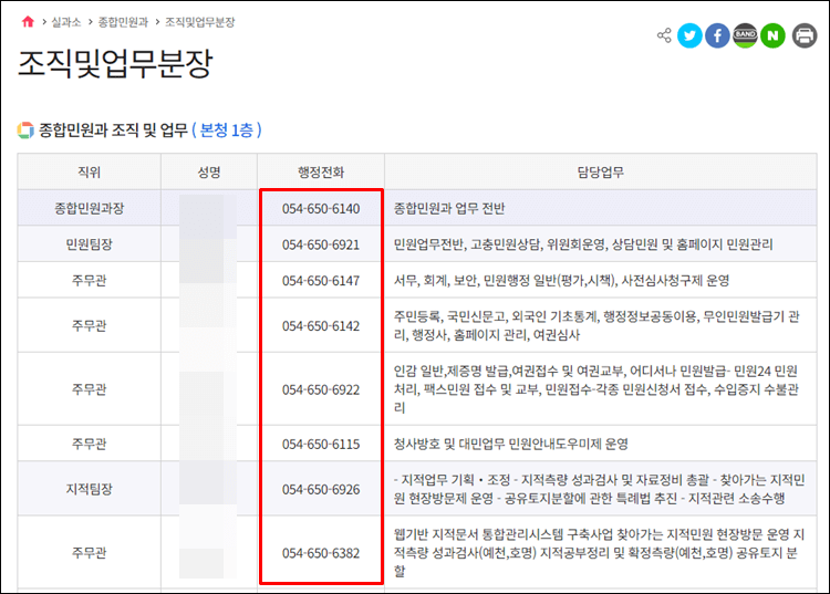 아래와 같이 예천군청의 종합민원과 직원들의 이름, 전화번호, 담당업무가 나오게 돼 빈다.