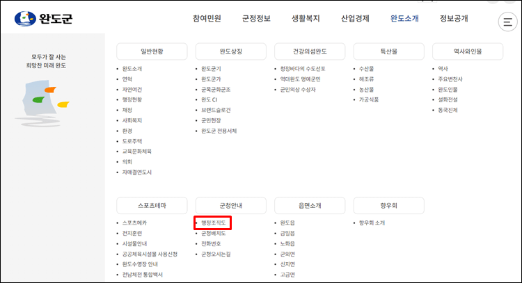 완도군청 홈페이지를 방문하시면 아래와 같이 상단에서 완도소개 메뉴를 보실 수 있습니다.
