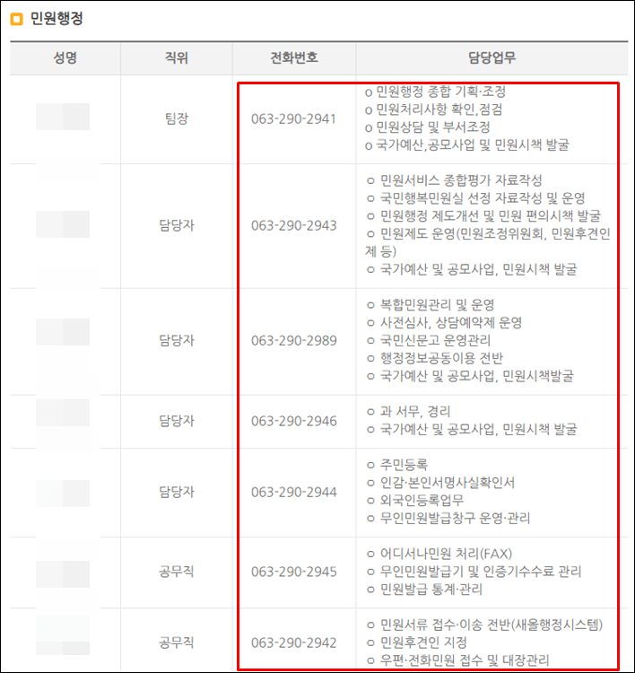 열린민원과를 클릭하시면 아래와 같이 민원행정을 보는 직원들의 성명, 직위, 전화번호, 담당업무를 보실 수 있습니다.